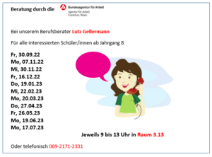 Am Montag, den 30.01.23 ist unser Berufsberater der Agentur für Arbeit, Lutz Gellermann zusätzlich von 9 bis 13 Uhr im Beratungsraum 3.13 und steht für alle Fragen zur beruflichen Orientierung zur Verfügung.
