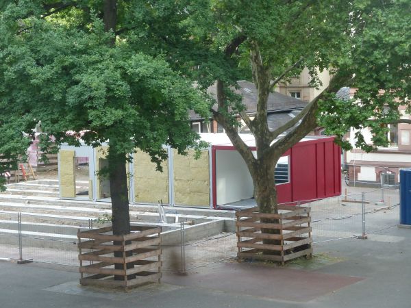 Die Container sind da! Am Montag, 16. Juni 2014 wurden die ersten Containerelemente auf dem Schulhof aufgestellt.