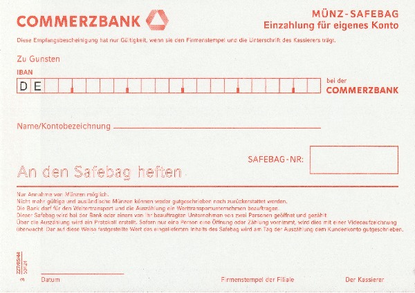 Wenn der Kunde sehr viele Münzen einzahlen will, kann der Kassierer ein Safebag nehmen. Die Münzen werden hineingegossen, und das Safebag wird ins Zentrum geschickt, wo es gutgeschrieben wird.