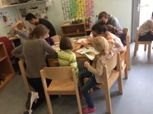 Vor Ort wurden wir freundlich von Frau Frank, den Erzieherinnen und den Kindern empfangen. Kurz nach unserer Ankunft wurden wir in einen Raum geführt, wo wir den Kindern anschließend vorlesen durften. Die Kinder hatten die Möglichkeit, sich Bücher auszusuchen, die wir ihnen vorlesen sollten. Sie haben nicht nur vorgelesen bekommen, sondern sie erzählten uns auch ihre Geschichten.