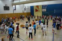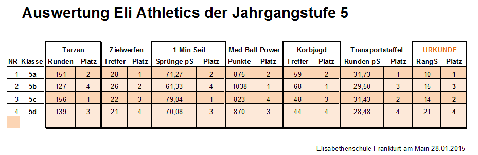 An sieben Stationen, wie z.B. dem Tarzan-Schwingen, Medizinballstoßen, Balltransport oder Zielwerfen konnten die Klassen ihre Sportlichkeit unter Beweis stellen. In acht Minuten mussten alle Schülerinnen und Schüler im Klassenteam möglichst viele Punkte sammeln, die zur Gesamtwertung herangezogen wurden. Die Helfer der Oberstufe zählten unter anderem 6540 Seilsprünge (Vielen, vielen Dank!). Auf dem Whiteboard konnten die aktuell besten Zwischenergebnisse im Live-Ticker beobachtet werden. Am Ende setzte sich die Klasse 5a deutlich vor den Klassen 5c und 5b durch. Die Klasse 5d kam auf den vierten Platz.