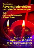 Wie in den vergangenen Jahren wird der Eli-Chor wieder weltliche und geistliche Lieder in adventlicher Atmosphäre und wunderbarer Akustik in der Liebfrauenkirche singen (Nähe Hauptwache, umgeben vom Weihnachtsmarkt). Der Eintritt ist frei und wir freuen uns über ein großes Publikum!