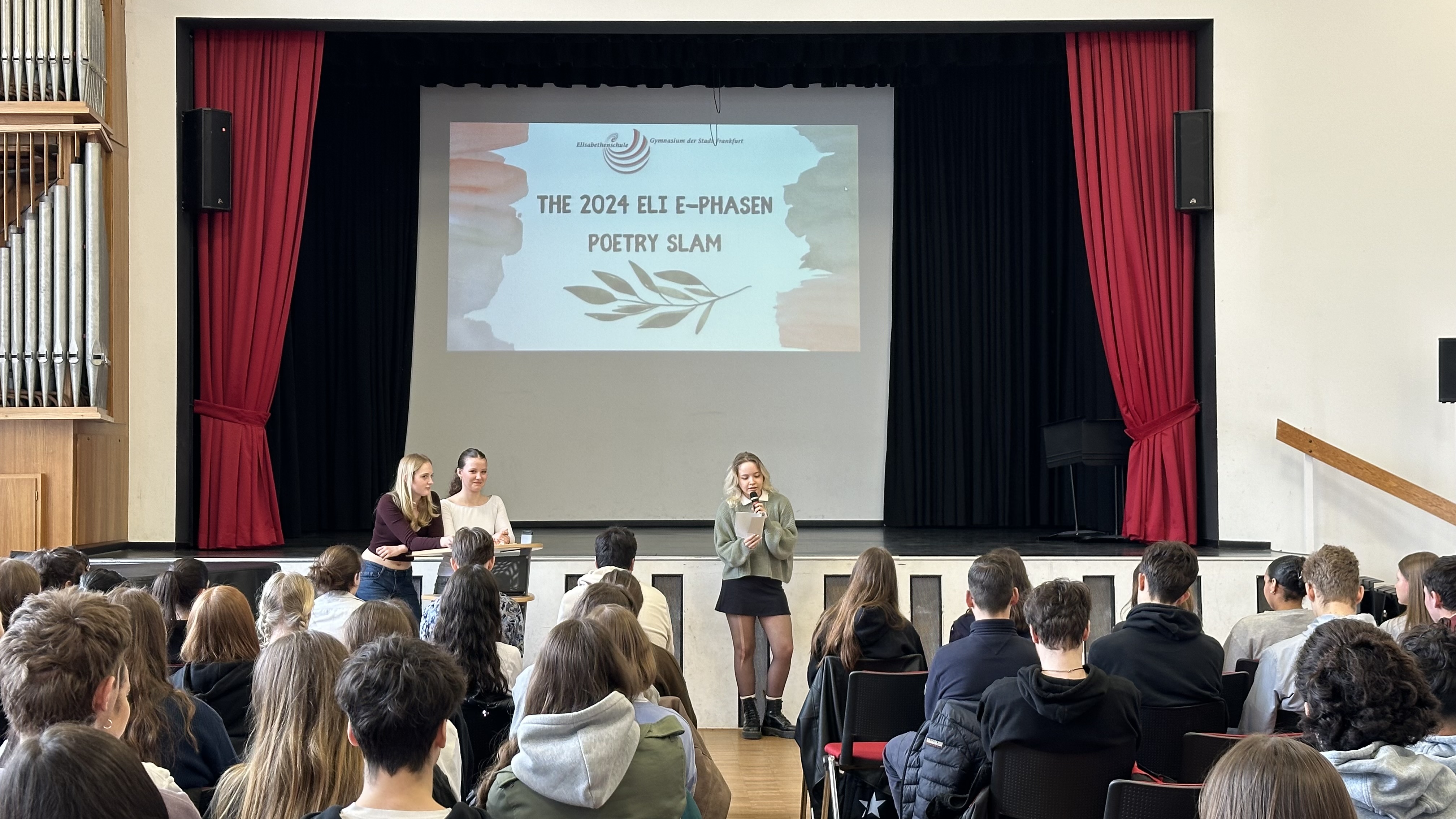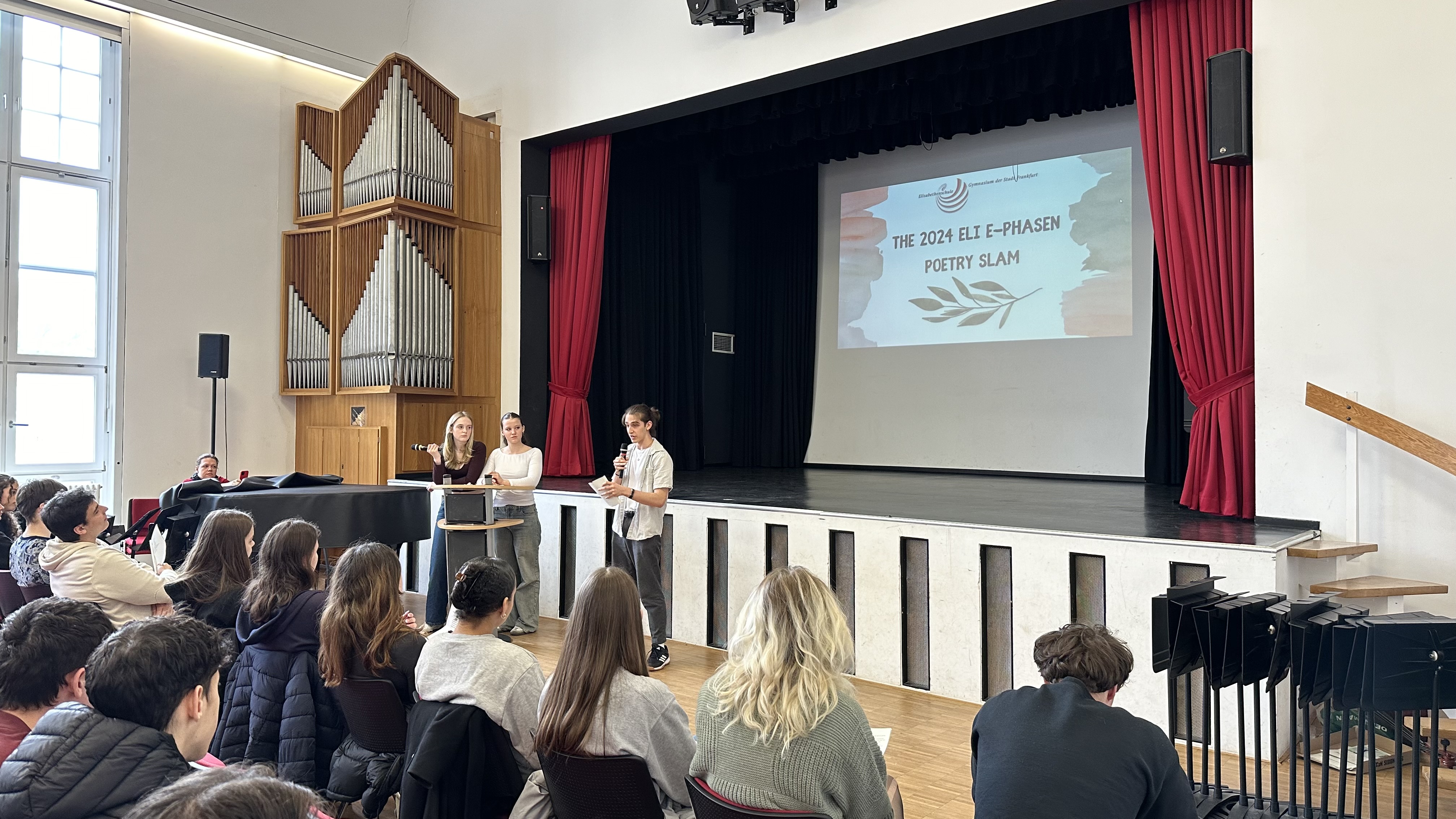 In einer gut gefüllten Aula traten die zwölf Finalist:unnen gegeneinander an. Je zwei Kandidat:innen qualifizieren sich zuvor in ihren Englischkursen für das entscheidende Finale.