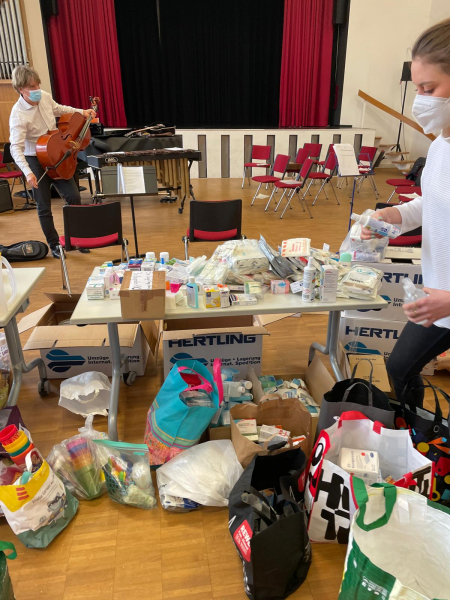 Schnell war die Aula gefüllt und etliche Schülerinnen und Schüler halfen engagiert beim Sortieren, Verpacken und Verladen der Spenden. Max aus der E-Phase organisierte spontan einen Transporter, sodass ein erster Teil der Spenden rasch auf den Weg an die ukrainische Grenze gebracht werden konnte.