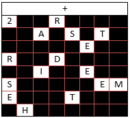 Die schwarzen Felder sind aus Karton, die Weißen sind ausgeschnitten. Am Anfang ist das Kreuz oben. Unser Text, der zu verschlüsseln ist, ist der folgende: „2.Raster: Diese Methode wurde im Buch Mathias Sandorf von Jules Verne erklärt.“ Wir nehmen jetzt unser Raster, legen es auf ein Blatt und fangen an, die Buchstaben hineinzuschreiben: