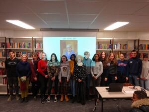 Etwa 20.000 jüdische Kinder wurden aus Deutschland, Österreich und der Tschechoslowakei nach dem Novemberpogrom 1938 nach Großbritannien und in andere Länder gebracht und somit vor dem Holocaust gerettet. Als Vorbereitung hatten wir im Unterricht den empfehlenswerten Film „Die Rettung der Zehntausend“ gesehen. In der Lesung mit Frau Lieberz-Groß haben wir dann anhand von Dokumenten und Fotos das berührende Schicksal der jungen Lore Jacobs kennengelernt. Zuletzt haben wir noch ein Foto vor ihrem auf der Leinwand projizierten Foto gemacht, mit dem wir die über 80-jährige Lore Jacobs nach England grüßen wollen.