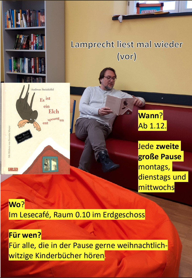 Liebe Schülerinnen und Schüler, ab diesen Montag, 1.12., mache ich wieder das Angebot, in den 15-Minuten-Pausen aus Andreas Steinhöfels Weihnachtsgeschichte "Es ist ein Elch entsprungen" vorzulesen.