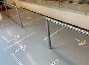 Hier seht man den Anstellbereichen und Laufwegen an der Essensausgabe. Nur die seitlichen Türen der Mensa dürfen vom Schulhof her genutzt werden.