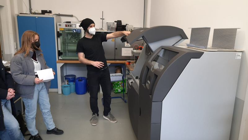 Die meisten, die schon einmal von 3D-Druck gehört haben, denken wahrscheinlich, wenn sie an 3D-Druck denken, an einen 3D-Drucker, der durch Schmelzen von Plastik Schicht für Schicht ein Objekt mit einer Düse aufbaut. Dies ist aber nur eine von vielen Techniken, die man zum Druck verwenden kann. 3D-Drucken kann man zum Beispiel auch mit Pulver, das geschmolzen wird, oder sogar mit flüssigem Kunststoff, der durch Licht ausgehärtet wird. Das und vieles mehr haben wir bei unserem Ausflug gelernt. Uns wurden aber auch die Maschinen gezeigt, die für die verschiedenen 3D-Druck-Techniken benötigt werden und wir konnten uns viele Drucke anschauen, an denen man die Vor- und Nachteile der einzelnen Techniken und deren Anwendungsmöglichkeiten sehen konnte, denn keine Technik ist perfekt und so hat auch jede 3D-Druck-Technik ihre Besonderheiten, durch die sie sich für spezielle Einsatzfälle eher eignet als für andere.