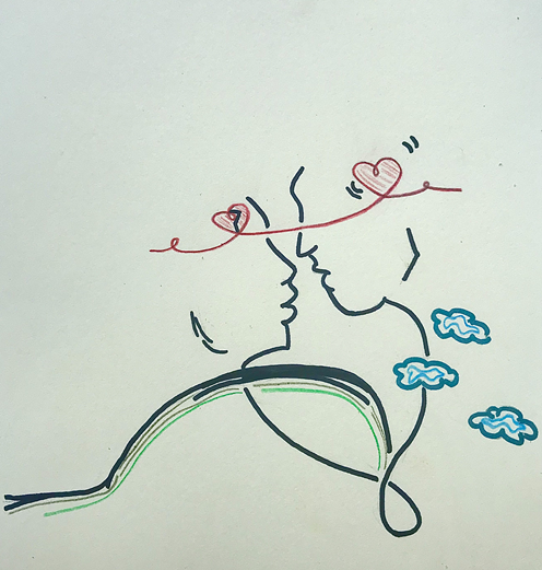 Wir stehen auf einem großen Hügel, mit dem Rücken Richtung Abgrund, den Blick aufeinander gerichtet. Hinter uns ein Meer aus Wolken. Hand in Hand. Zitternd. Ihre Augen glasig. Ein großes Lächeln auf unseren Lippen.