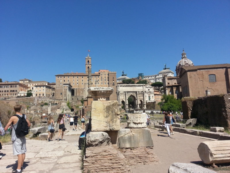 Danach, es war inzwischen schon ziemlich spät, ging es mit dem Bus wieder zurück zum Hotel, um gemeinsam Pizza zu essen. Am nächsten Morgen wanderten wir zum Kolosseum. Wir sind zwar nicht reingegangen, aber trotzdem wirkte das Amphitheater schon von außen sehr beeindruckend. Anschließend haben wir uns durch die vielen Touristen gedrängt, um zum Forum Romanum zu gelangen. Frau Liebenau hat uns einiges über das Forum erzählt, wie zum Beispiel über die Vestalinnen, die im alten Rom das Herdfeuer zu bewachen hatten, und die Bedeutung der einzelnen Gebäude. Dann saßen wir noch an der Stelle des alten Kapitols, wo die wichtigsten Götter der Antike, Jupiter, Juno und Athene, angebetet wurden. Zum Schluss haben wir uns entschieden zum Trevi- Brunnen zu laufen, um eine Münze hineinzuwerfen und damit sicher zu gehen, dass wir wieder nach Rom kommen.
