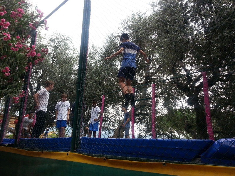 Es war schön warm, sprich: viel zu heiß, an die 40 Grad und es gab einen Pool, der für uns aber nicht in Frage kam, weil man da Badekappen tragen musste. Da es daneben aber auch Trampoline gab, war es in unserer Freizeit sehr lustig.