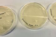 Zwischendrin haben wir ein kleines Experiment gemacht, in dem wir mit ungewaschenen, gewaschenen und desinfizierten Händen jeweils einen Nährboden kontaminiert haben. Über Nacht lagerten die Petrischalen im Brutschrank und am nächsten Tag waren tatsächlich Bakterienkulturen sichtbar. Je sauberer die Hände, desto weniger Bakterien waren auf dem Nährboden gewachsen. (Foto: Experiment)