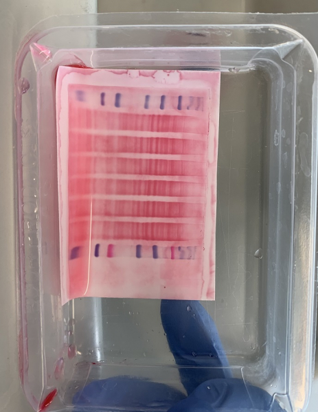 Eine SDS-page, also Proteine auf einer Membran, rot eingefärbt.
