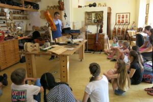 Der zweite Tag wurde genauso toll: In Begleitung von zwei netten Lehrerinnen fuhren wir mit dem Zug nach Geisenheim. Nach unserer Ankunft besuchten wir den Geigenbauer Herrn Jacobi. Er erklärte uns ausführlich, wie eine Geige aufgebaut ist, wie man sie baut und welche Werkzeuge und Bauteile man dafür benötigt. Nach dem Besuch beim Geigenbauer machten wir ein Picknick neben dem Dorfbrunnen. Wer fertig mit essen war, durfte sich in kleinen Gruppen die Stadt anschauen.