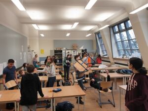 Am ersten Tag beschäftigten sich die Schülerinnen und Schüler in zwei Gruppen mit „Hate Speech“ und „Entstehung von Gewalt sowie Konfliktlösung“. Die Workshops wurden von der Anne-Frank-Bildungsstätte und vom Gewaltigen Theater angeboten.