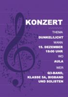 hiermit laden wir Sie herzlich zu unserem Konzert am 15. Dezember in unserer Aula ein. Das Konzert wird passend zu unserem Thema Dunkel/Licht gestaltet sein und Sie werden viele verschiedene Stücke aus allen Jahrgangsstufen hören.
