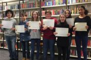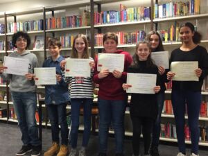 Third place went to Robin Cordemann, second to Jan Laufersweiler and first place to Sophia Gramlich. The referees had a hard time deciding because all the students were very impressive and the books that were selected, too. You never know how many amazing readers there are at our school and every one appreciated the great presents.