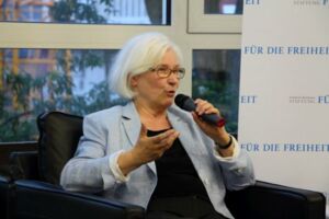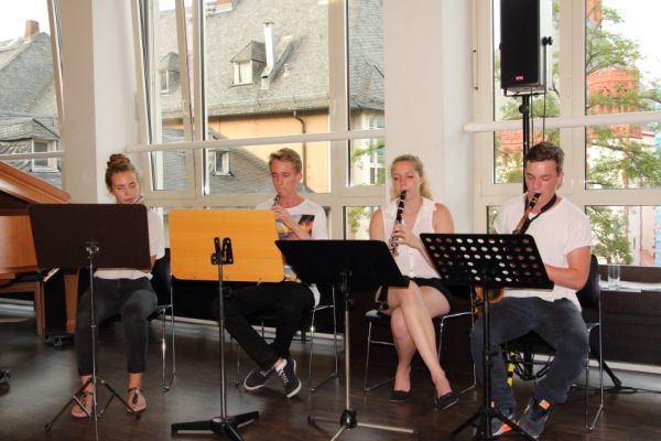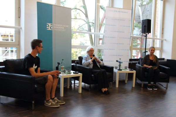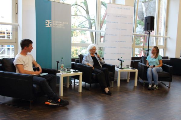 Am 22.7.2014 war die amtierende Präses der Evangelischen Kirche Deutschlands Frau Dr. Irmgard Schwaetzer zu Gast in der Ev. Akademie am Römer. Die Schülerinnen und Schüler der Q-Religionskurse von Frau Simon und Herrn Leonhardt bereiteten den Abend sowohl inhaltlich wie organisatorisch vor: