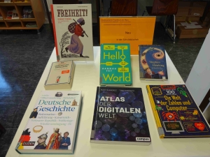 Die neue Kinder- und Jugendliteratur beinhaltet unter anderem einige aktuelle Titel aus dem Medienprojekt "JungeMedienJury" der Stadtbücherei Frankfurt. Der Sachbuchbereich bietet zum Beispiel Neuerscheinungen zu Musiktheorie, Digitalisierung, Rassismus und Umweltpolitik. Einige Eindrücke findet ihr auf den Fotos.