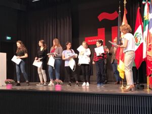 um sowohl die Juroren als auch das Publikum mit ihren Vorlesefähigkeiten zu beeindrucken. Die zu dieser Veranstaltung eingeladenen Ehrengäste (Frau Hischler, aus dem Kultusministerium; Herr Trejo, Generalkonsul Spaniens; Frau Villanueva, Generalkonsulin Mexikos; Frau Gallardo, stellvertretende Konsulin Perus) unterstützten den feierlichen Charakter des Wettbewerbs und waren maßgeblich an der angenehmen Grundstimmung beteiligt.
