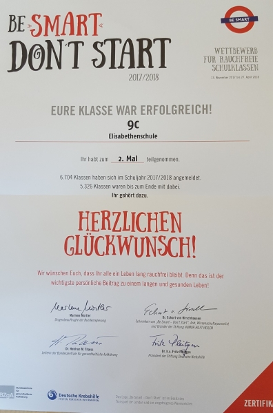 Die Klassen 7b und 9c haben erfolgreich am Bundeswettbewerb für rauchfreie Schulklassen „be smart – don`t start“ teilgenommen. Hierfür wurden sie mit einem Zertifikat ausgezeichnet.