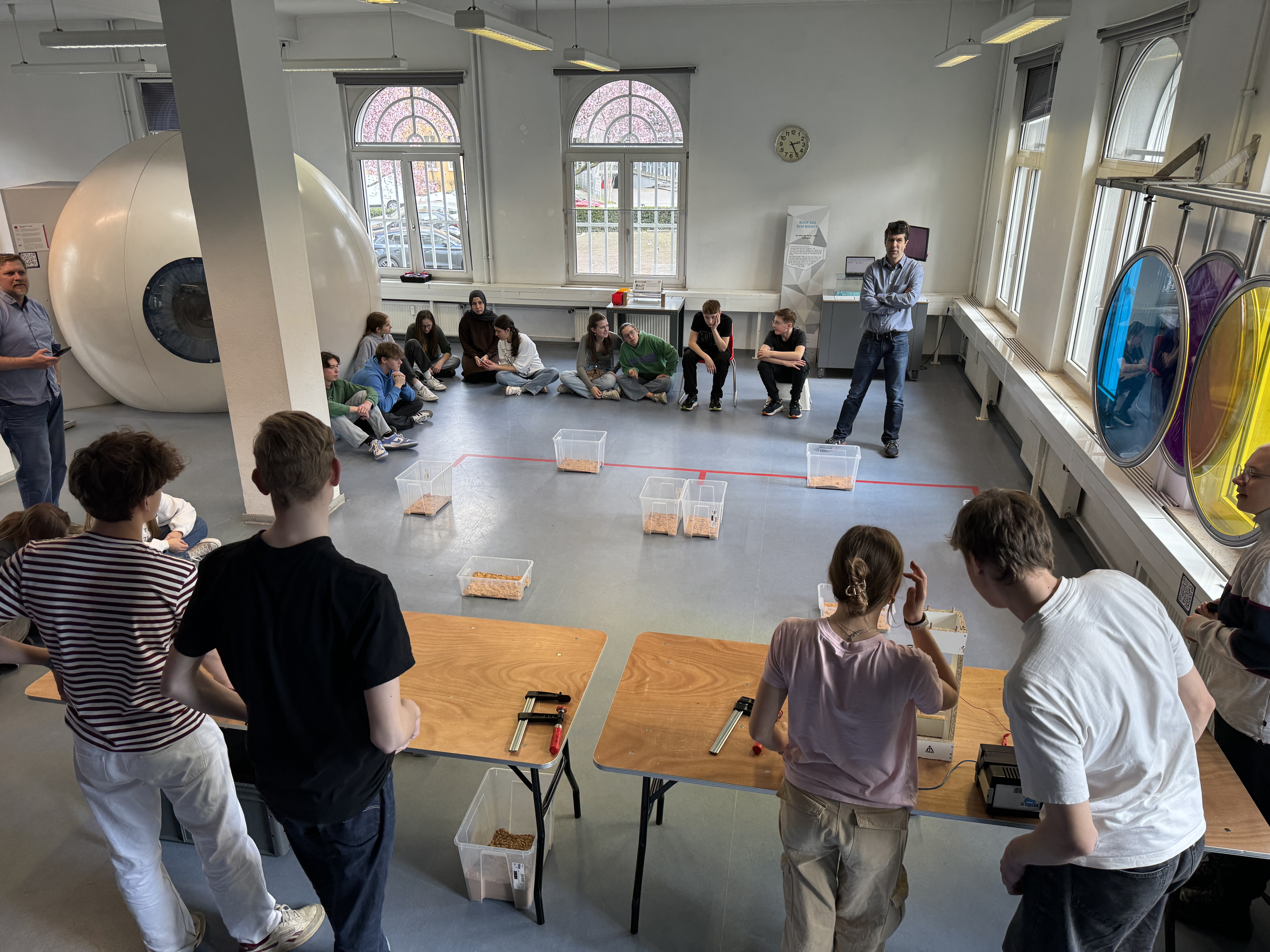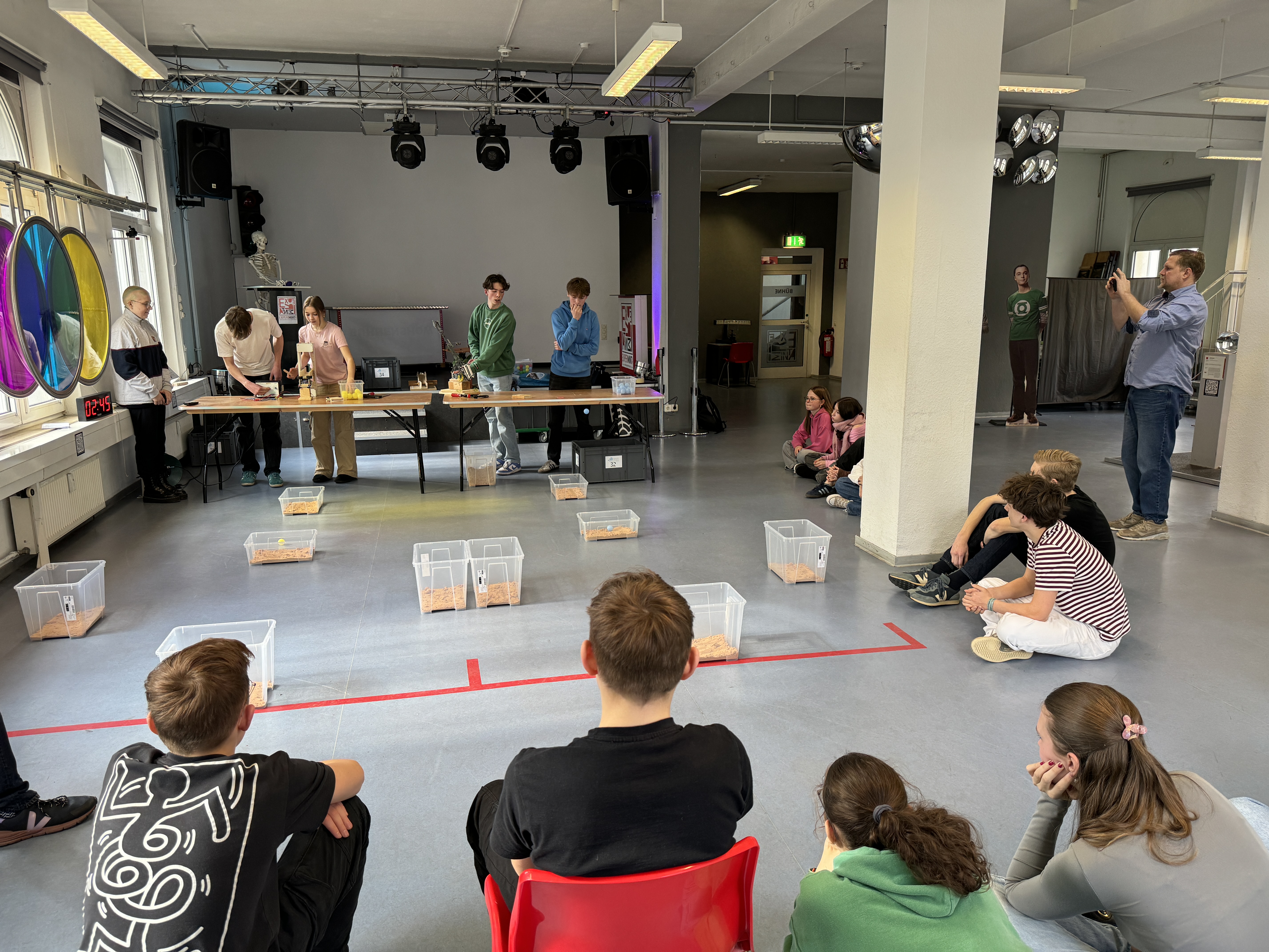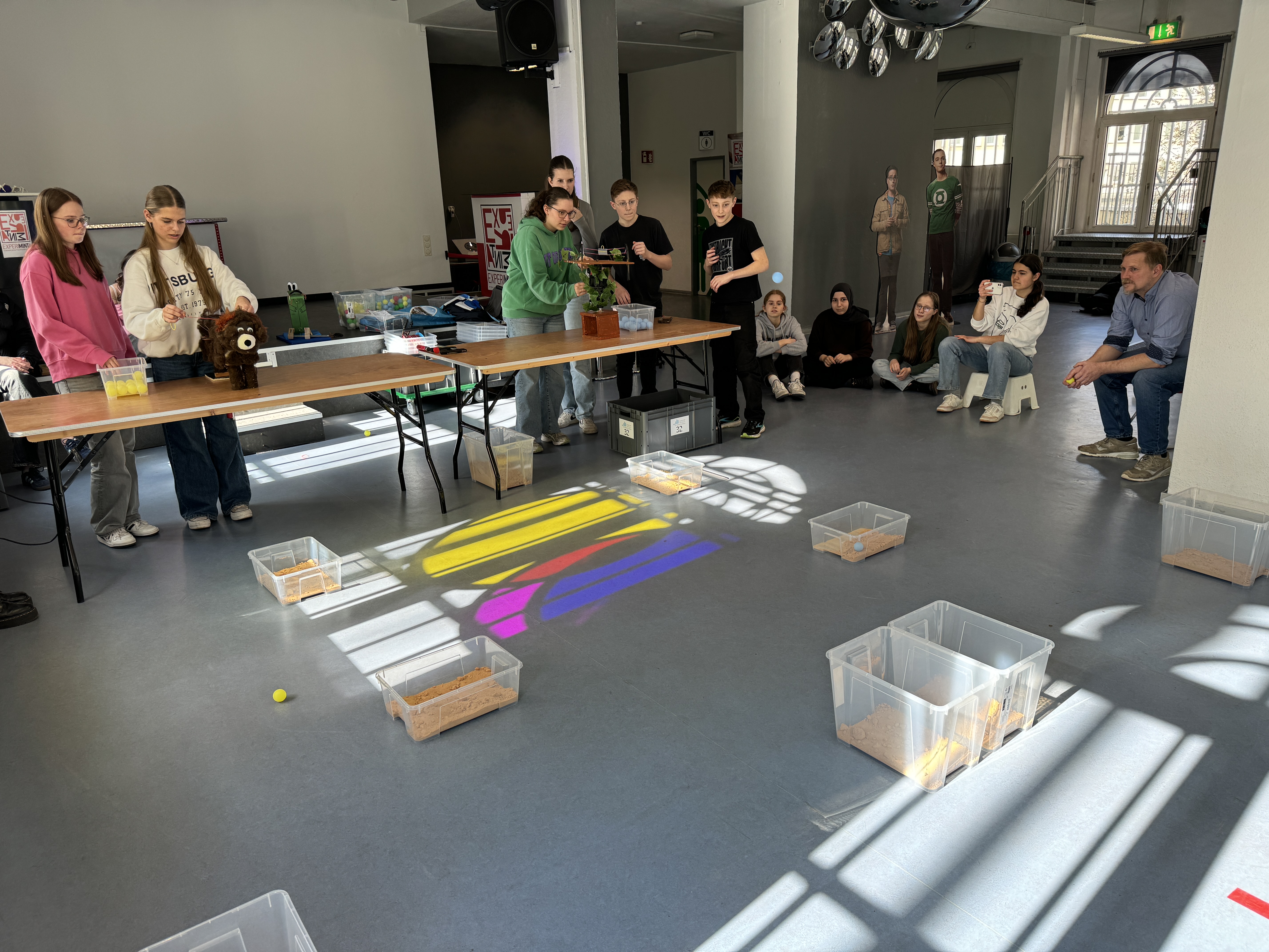 Bei dem Wettbewerb, an dem jeweils 3 Gruppen der 9. und 3 Gruppen der 10. Klasse teilnahmen, mussten mithilfe der selbstgebauten Maschinen innerhalb von 3 Minuten so viele Tischtennisbälle wie möglich in vor den Maschinen aufgebaute Behälter geschossen werden. Es gab für jedes Team 5 Behälter und pro Runde maximal 25 Bälle zur Verfügung. In den Vorentscheiden der 9. und 10. Klasse traten jeweils 2 Teams mit ihren Maschinen gegeneinander an. Daraufhin ist der Sieger der 9. Klassen gegen den Sieger der 10. Klassen angetreten. Mit Stolz können wir sagen, dass das Team „Rufus“ aus der 9. Stufe diesen Wettbewerb gewonnen hat. Trotzdem gilt ALLEN Teilnehmer*innen ein herzlicher Glückwunsch zu ihren tollen Leistungen und ein riesengroßer Dank an Hrn. Stietzel und Hrn. Katzenberger, die uns nicht nur beim Wettbewerb, sondern auch bei allen Fragen rund um den Bau immer super geholfen haben.