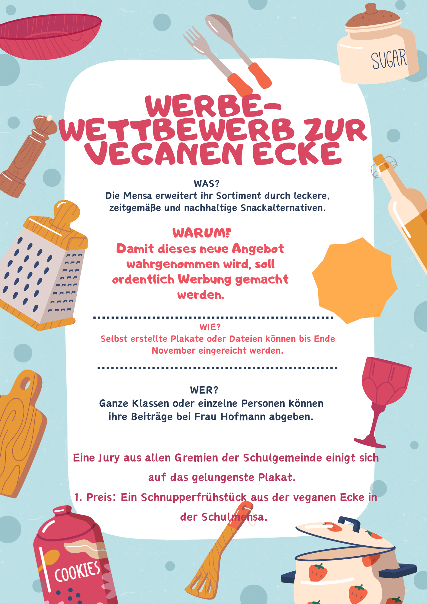 Liebe Schülerinnen und Schüler, ab Dezember 2025 wird es im Snackbereich der Mensa eine „Vegane Ecke“ geben. Damit dieses leckere und zeitgemäße Angebot möglichst gut bekannt gemacht wird, starten wir hierzu einen Wettbewerb! Schaut euch hier das Plakat zum Wettbewerb an! Vielleicht habt ihr ja Lust, mitzumachen!