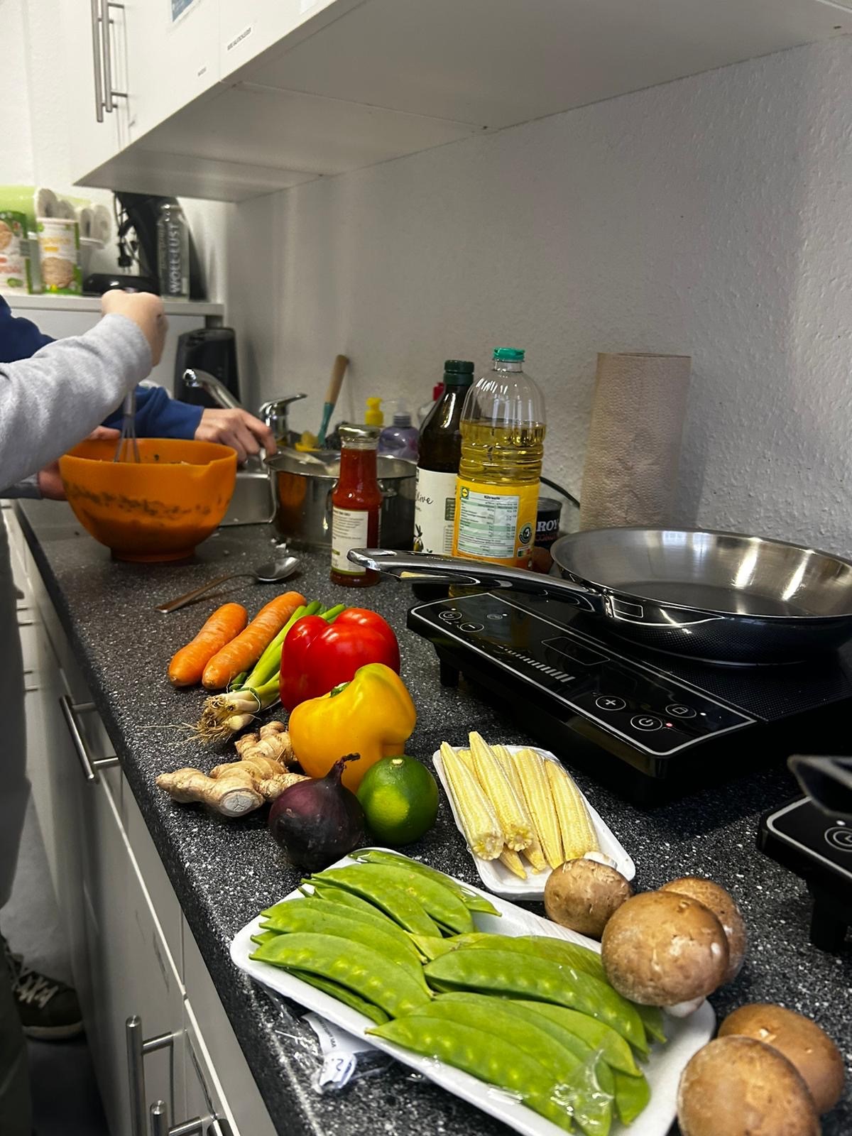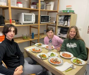 Jeden zweiten Montag traf man sich dort und konnte neue Erfahrungen sammeln: Rezepte aussuchen, mitentscheiden, selbst tätig werden und dabei auch noch neue vegetarische Rezepte kennenlernen. Das war das Konzept des AG Angebots, das auf Initiative von Kiki Brodmerkel, einer Mutter aus den Reihen der Elternschaft der Elisabethenschule, erfolgreich umgesetzt werden konnte.