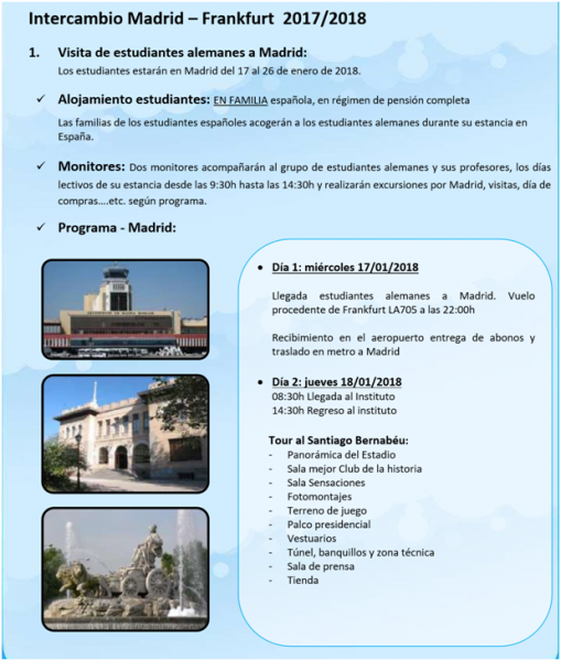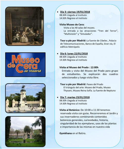 Vom 17.- 26.01. sind 53 Schüler der 7. Klassen in Madrid in Gastfamilien untergebracht, um die spanische Sprache und Kultur hautnah zu erleben. Vier Lehrkräfte begleiten die Schüler vormittags durch die faszinierende Hauptstadt Spaniens.