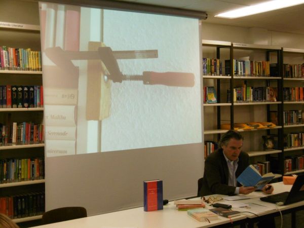 In der Geschichte „Claire – Kunstatome, Kanten und Schnitte“, aus der Axel Dielmann ausgewählte Passagen vorlas, geht es um einen Sammler der befremdlichen Art: Mit chirurgischer Präzision löst er in Museen unbemerkt Teile aus Kunstwerken, um diese dann bei sich zu Hause auszustellen. Seine Wohnung wird somit zu einem Kabinett fragmentarischer moderner Kunst, gespickt mit Stofffetzen, Leinwandfäden und sogar einer Schraubzwinge – Kunstatome, wie der Icherzähler sie nennt. Seine Obsession kann er seiner neuen Bekanntschaft, einer Kunsthistorikerin, natürlich nicht lange verheimlichen.