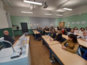 Dieser berichtete sehr anschaulich und an vielen Stellen humorvoll von seinem Leben in der ehemaligen DDR. Sachse war ins Visier der Staatssicherheit geraten und wurde mehrfach festgenommen und verurteilt. In verschiedenen Gefängnissen bekam er die Repressalien des Sozialismus zu spüren. Der Gast las zunächst einzelne Passagen seiner Erlebnisse in Haft aus seinem Buch „Die Akte S. Fünf Jahre in den Mühlen des MfS“. Anschließend berichtete er, wie er nach einem fingierten Selbstmord-versuch auf dem Berliner Alexanderplatz nach 36 Monaten Haft von der Bundesrepublik Deutschland freigekauft wurde. Am Ende durften die Schüler*innen ihm Fragen stellen, teilweise auch sehr persönliche. Beide Geschichtskurse hörten während der gesamten Veranstaltung gespannt zu und zeigten großes Interesse. Hierbei wurde deutlich, wie lebendig und hautnah Geschichte durch eine biographische Annäherung wird.
