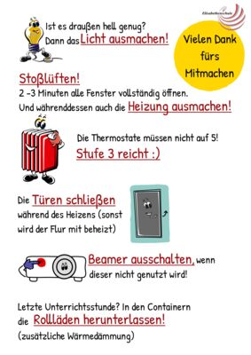 ! Jeder kann zum Energiesparen beitragen: macht einfach eure Klasse auf das Thema aufmerksam. Zum Beispiel, indem ihr darauf hinweist, wie rücksichtslos es ist, beispielsweise die Heizung auf 5 zu stellen, wenn alle Fenster geöffnet sind. !