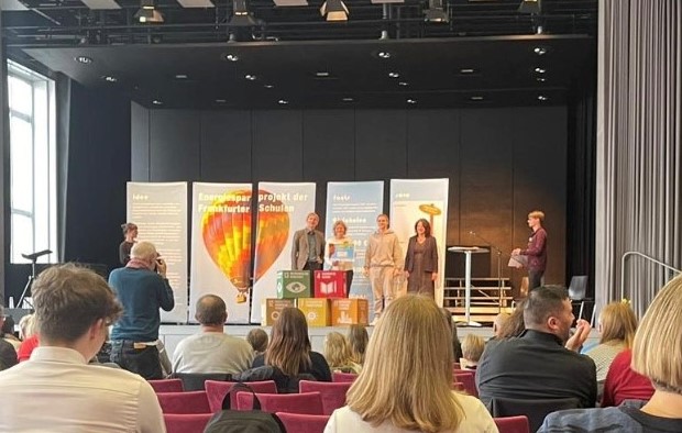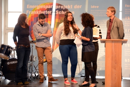 Um zu sehen, ob sich unsere Aktivitäten lohnen und wie wir auch im Vergleich mit anderen Schulen dastehen, gehen wir regelmäßig auf die Prämienfeiern der Frankfurter Schulen im Energiesparprogramm und nehmen dort unsere Energiesparprämie für das vergangene Jahr entgegen.