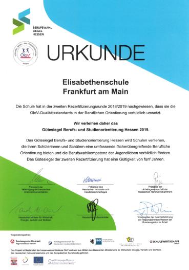 Die Elisabethenschule ist das erste Gymnasium in Frankfurt, dessen Berufs- und Studienorientierung mit dem Gütesiegel ausgezeichnet wurde.