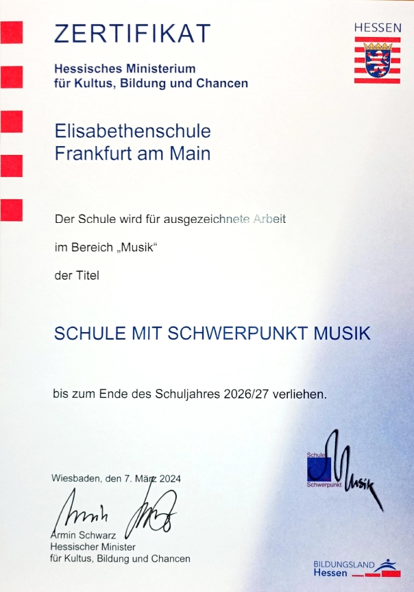 Die Elisabethenschule war einer der ersten Schulen in Frankfurt am Main, deren Arbeit im Schwerpunkt Musik durch das Hessische Kultusministerium mit der Auszeichnung "Schule mit Schwerpunkt Musik" zertifiziert wurde.