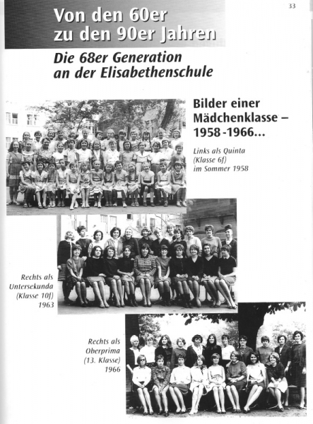 Leider finden wir jedoch die anderen Mitschülerinnen nicht mehr. Es sind außer uns nur noch 4, denn unsere Abiturklasse (O Ie) bestand nur aus 10 Mädchen, die jetzt um die 70 Jahre alt sein dürften und hoffentlich noch gesund und munter sind wie wir. 1965 war die Elisabethenschule noch ein reines Mädchengymnasium und der Jahrgang war noch in einen sprachlichen Zweig (O Ie) und einen mathematisch- naturwissenschaftlichen Zweig (O If) aufgeteilt.