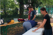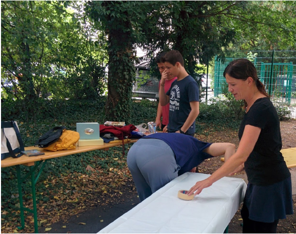 Sonntag, den 19.07 um 15:45 begannen die Vorbereitungen für den Markt auf dem Schulgelände der Elisabethenschule. Einige Tage zuvor hatte uns die Cafeteria freundlicherweise Biertische zur Verfügung gestellt, die wir nutzten. Mit der Hilfe vieler Hände und Hirne war der Aufbau schnell erledigt. Auf die Tische wurden weiße Papiertischdecken gezogen, um ein schöneres und vereinheitlichtes Aussehen zu erzeugen. Jeder Tisch erhielt eine stille und eine kohlensäurehaltige Flasche Wasser und Becher.