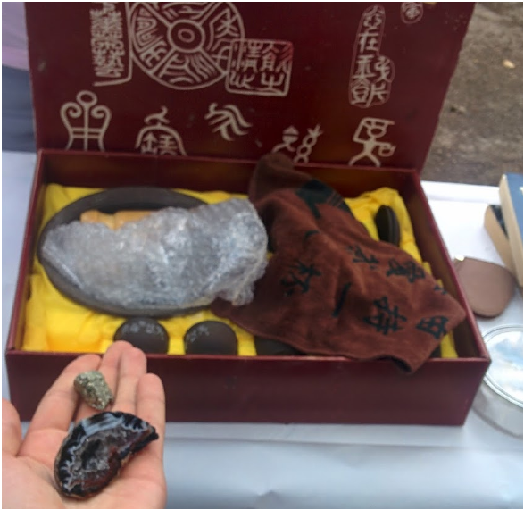 Um 16:30 begann schließlich der DialogMarkt. Es erschienen in Summe 18 Menschen um gemeinsam das Konzept “Tauschen und Austauschen” zu testen. Die mitgebrachten Gegenstände waren so unterschiedlich wie die Tauscher selbst. Von Edelsteinen, über chinesische Suppenschalen, Hüte, Muffins, Bücher, japanisches Teegeschirr bis hin zu einer Trommel. Abbildung: Einige Edelsteine wurden gegen das japanischeTeegeschirr getauscht.