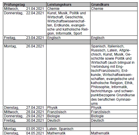 Das schriftliche Landesabitur findet im Zeitraum vom 21. April bis 05. Mai 2021wie folgt statt, Um den bis zu den schriftlichen Prüfungen zur Verfügung stehenden Unterrichtskorridor zu vergrößern: