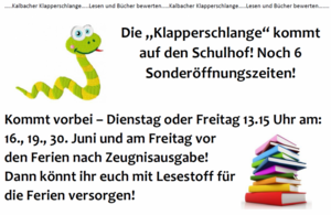Kommt vorbei - Dienstag oder Freitag 13:15 Uhr am: 16., 19., 30. Juni und am Freitag vor den Ferien nach Zeugnisausgabe! Dann könnt ihr euch mit Lesestoff für die Ferien versorgen! Bitte bringe zur Ausleihe den ausgedruckten, ausgefüllten und unterschriebenen Anmeldebogen und die 5 Euro Unkostenbeitrag mit.