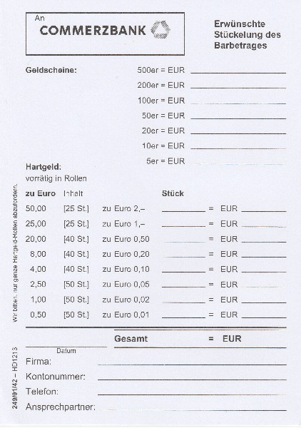 Zum Auszahlen braucht man die IBAN-Nummer des Kontos, woher man Geld abheben möchte, einen Personalausweis und seinen Unterschrift. Man kann auch Geld wechseln, aber man muss zuerst die gewünschte Währung bestellen. Danach kann man es abheben, aber dazu braucht man ein Konto bei der Commerzbank, außerdem bekommt die Commerzbank durchschnittlich 15% Gewinn. (Commerzbank AG - Sortenkurse, 2016)