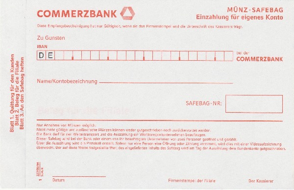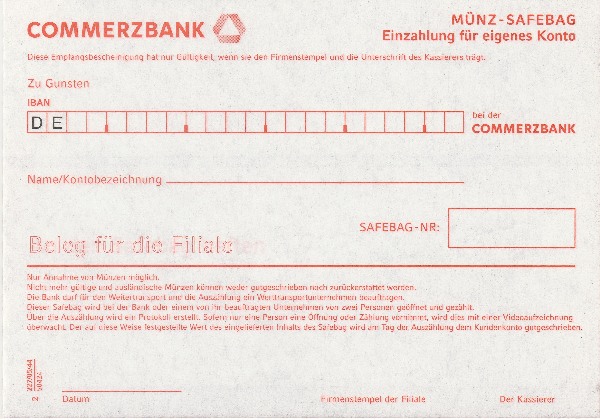 Wenn der Kunde sehr viele Münzen einzahlen will, kann der Kassierer ein Safebag nehmen. Die Münzen werden hineingegossen, und das Safebag wird ins Zentrum geschickt, wo es gutgeschrieben wird.