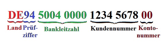 Am Anfang kommt der zwei Buchstaben enthaltende Landescode. Die Stellen eins bis drei der Bankleitzahl bilden die Ortsnummer, die einen Bankplatz (Ort der Filiale der Deutschen Bundesbank) sowie den zugehörigen Bankbezirk (Bankplatz und das angrenzende Gebiet) kennzeichnet. Zum Beispiel gehören die Ortsnummer 500, 501, 502, 503, 504, 514 und 524 zu Frankfurt. Die Stelle danach bezeichnet das Banknetz. Zum Beispiel gehört 1 zu Postbank, 4 und 8 zu Commerzbank, 5 zu Sparkassen und 7 zur Deutschen Bank. Die letzten vier Ziffern werden vom Geldinstitut festgelegt. (Wikipedia - Bankleitzahl, 2016)