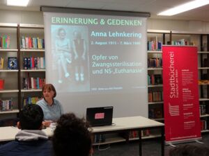 Anna Lehnkering, 1915 in Oberhausen geboren, war geistig behindert. Nach dem fünfjährigen Besuch einer Hilfsschule durfte sie keinen Beruf erlernen, sondern half ab 1929 der Mutter im Haushalt. Im Jahre 1935 wurde sie – da sie als vermeintlich „erbkrank" galt – zwangssterilisiert. Ende 1936 wurde sie in die Heil- und Pflegeanstalt Bedburg-Hau eingewiesen, im März 1940 schließlich im Zuge der „Aktion T4“ nach Grafeneck deportiert. Dort wurde sie als „unwürdiges Leben“ in der Gaskammer ermordet.