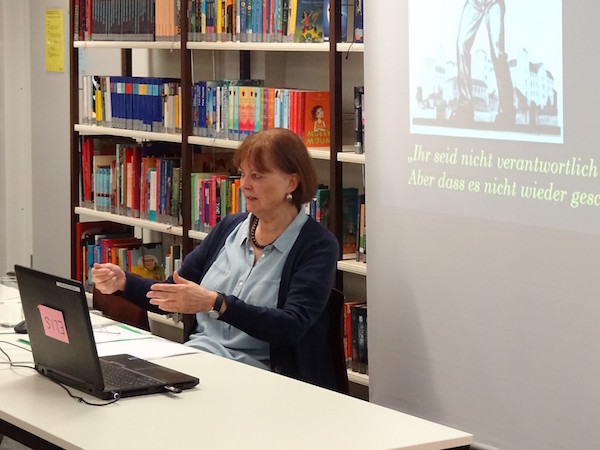In der Schulbibliothek Elisabethenschule & Fürstenbergerschule stellte Sigrid Falkenstein Oberstufenkursen ihr Buch „Annas Spuren“ vor. Darin erzählt sie das Schicksal ihrer Tante Anna Lehnkering.