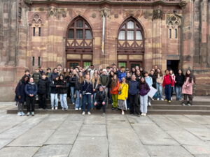 Am Montag begann unsere Frankreichfahrt. Kurz nach unserer Ankunft kamen schon unsere französischen Austauschschüler an und wir lernten uns kennen. Obwohl es anfangs ein bisschen schwierig war, miteinander zu sprechen, konnten wir mit einer Mischung aus Englisch, Deutsch und Französisch kommunizieren und langsam ging es auch besser. Zuerst spielten wir Kennenlernspiele, die das Team der Begegnungsstätte für uns vorbereitet hatte, und gingen danach in die kleine Stadt Niederbronn-les-Bains, um eine Rallye zu machen und den Ort zu erkunden. Einige waren am Anfang etwas zögerlich, aber schließlich machte es Spaß, mit fremden Menschen zu sprechen und mehr über die Stadt zu erfahren.