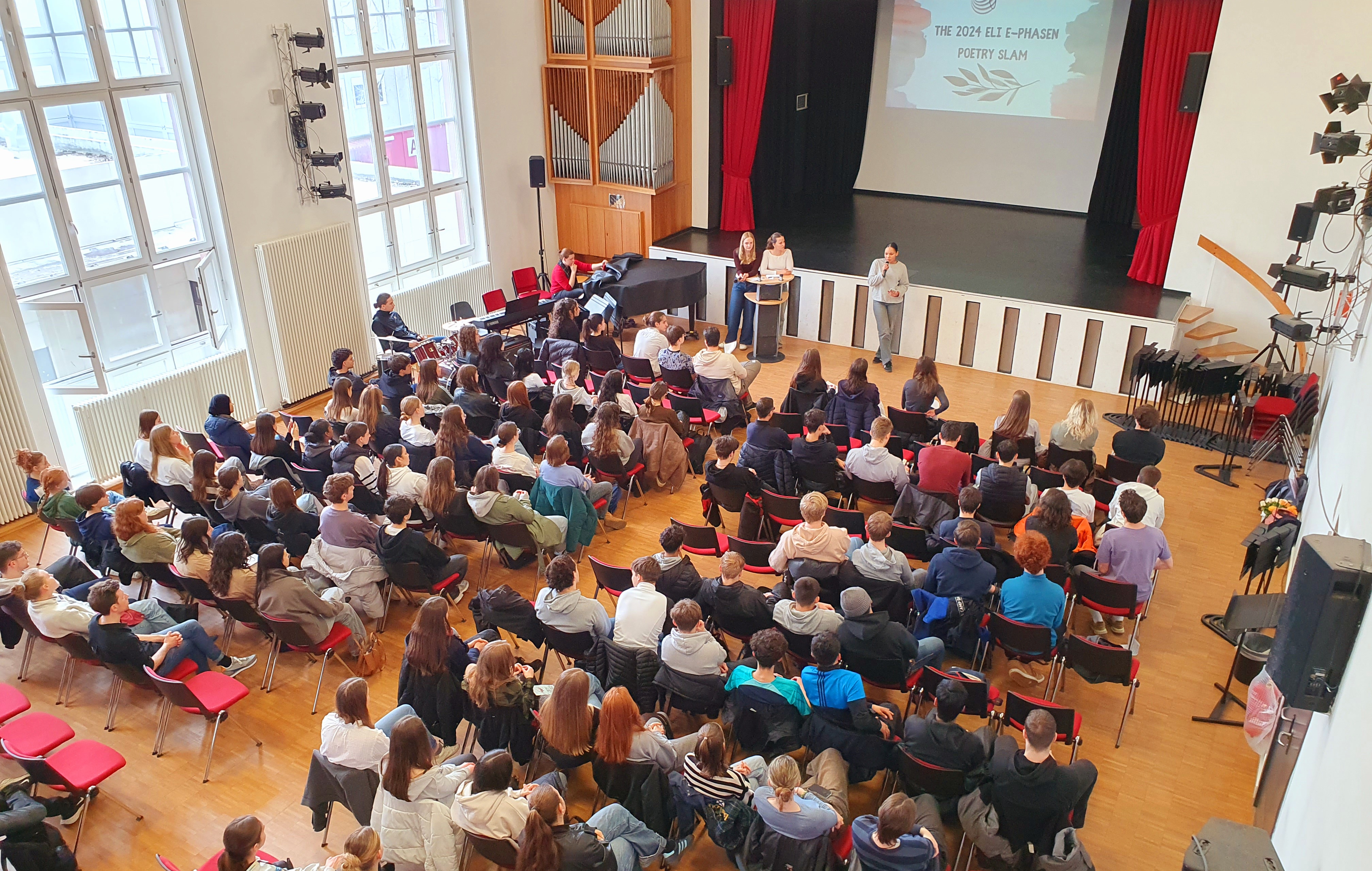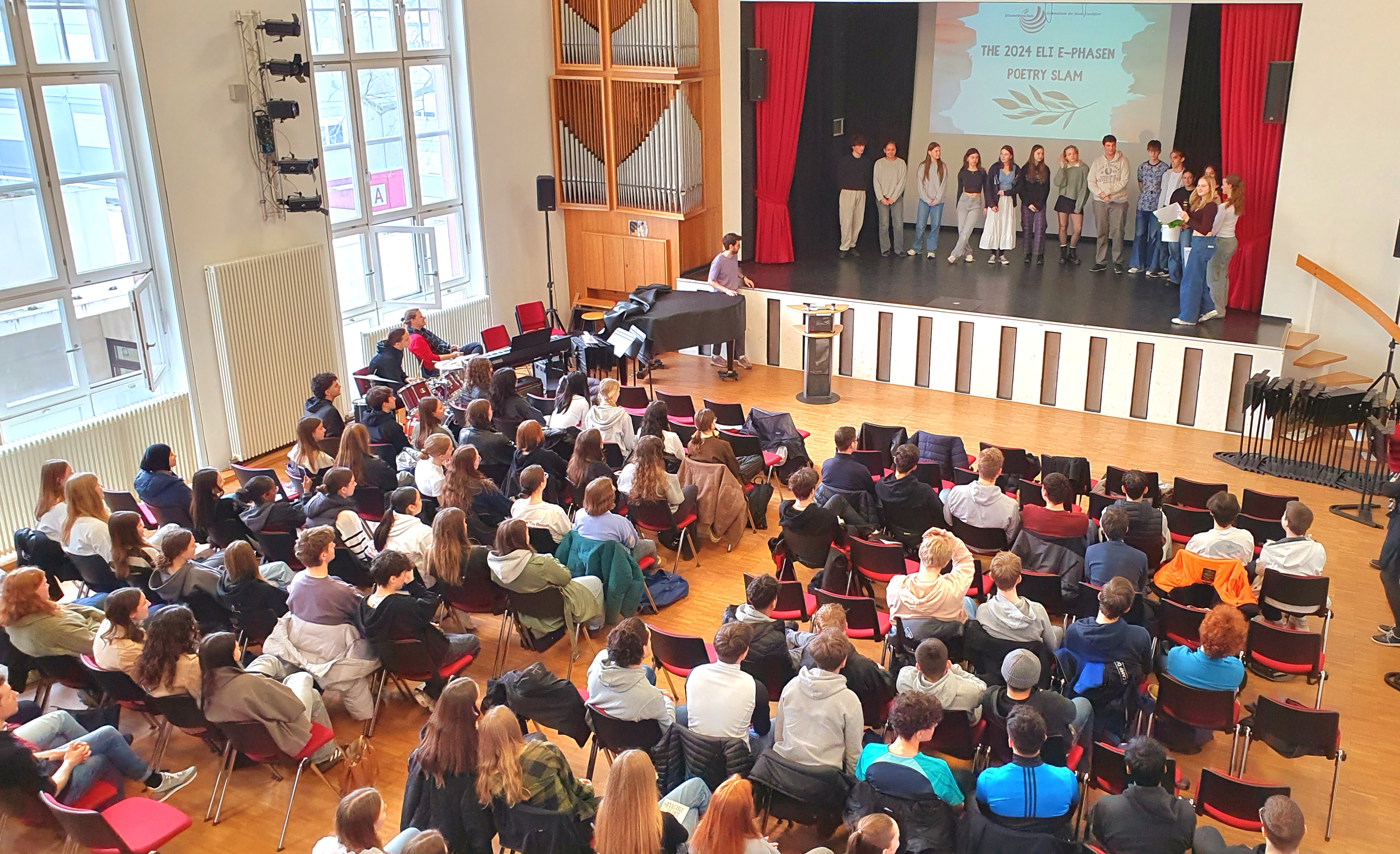In einer gut gefüllten Aula traten die zwölf Finalist:unnen gegeneinander an. Je zwei Kandidat:innen qualifizieren sich zuvor in ihren Englischkursen für das entscheidende Finale.