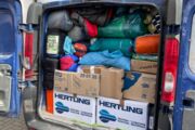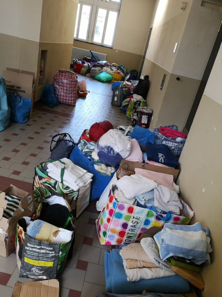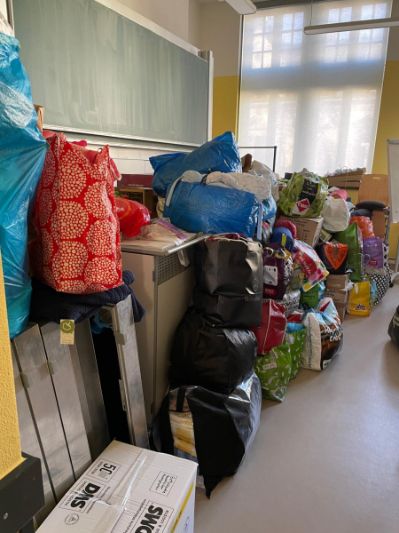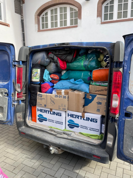 Schnell war die Aula gefüllt und etliche Schülerinnen und Schüler halfen engagiert beim Sortieren, Verpacken und Verladen der Spenden. Max aus der E-Phase organisierte spontan einen Transporter, sodass ein erster Teil der Spenden rasch auf den Weg an die ukrainische Grenze gebracht werden konnte.