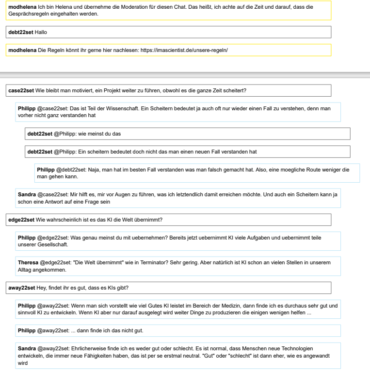 Drei Wissenschaftler*innen haben die – VIELEN – Fragen der Schüler:innen geduldigst beantwortet und auch ein wenig Einblick gegeben, was sie in ihren Forschungseinrichtungen machen und wie sie dorthin gekommen sind. Das Team von I´am a Scientist hat das Ganze super organisiert und ohne viel Aufwand konnten die Schüler:innen mal andere Eindrücke gewinnen. Das hat sich wirklich mal gelohnt !